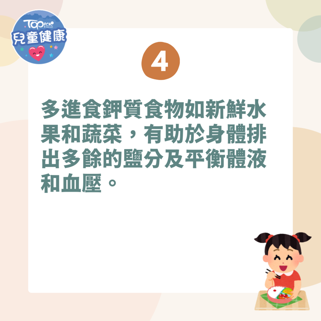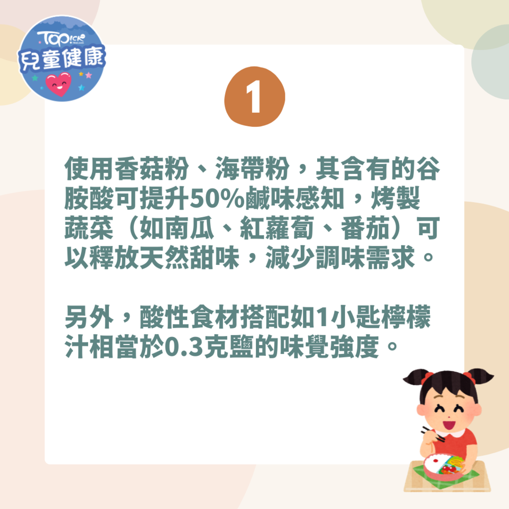 在現代飲食環境中,「隱形鹽」無所不在,長期高鹽飲食不僅增加未來高血壓、心血管疾病風險,更會影響兒童的味覺發展,形成「愈鹹愈想吃」的惡性循環。根據 WHO 建議兒童每日鈉分上限,1 歲內不需要鹽的額外攝取;1 – 3歲每日少於 800 毫克鈉;4 – 6 歲每日少於 1200 毫克鈉;7 – 10 歲每日少於約 2000 毫克鈉; 11 歲以上則每日少於 2400 毫克鈉。