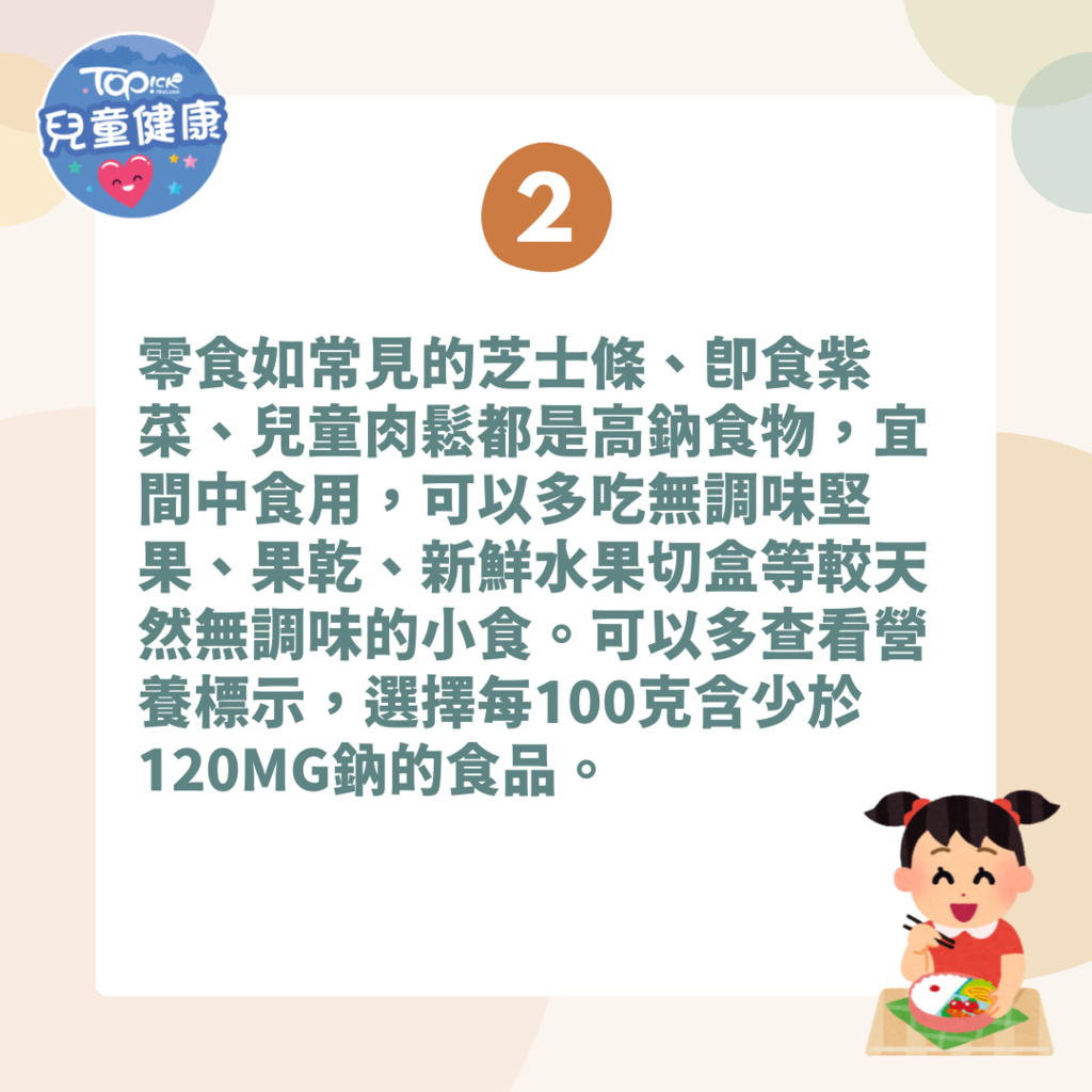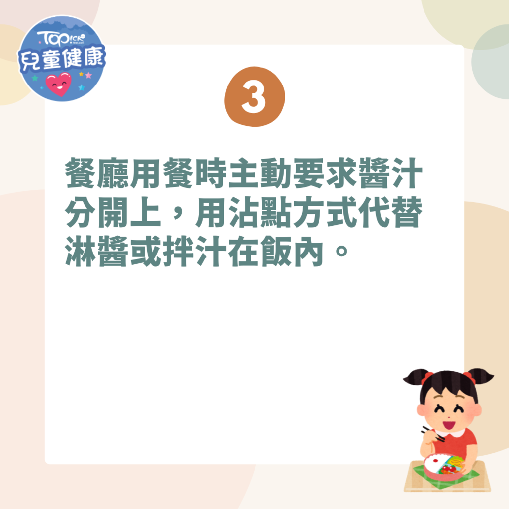 香港食物安全中心曾在 2015 年測試了 15 間本地食肆兒童餐的營養素含量,在鈉含量的測試中發現,最高鈉含量的組合可能超出 7 歲兒童每天建議攝入量上限的三分之一,更達到 4 歲至 6 歲兒童的每天建議攝入上限(1,200 毫克)的 2 倍。