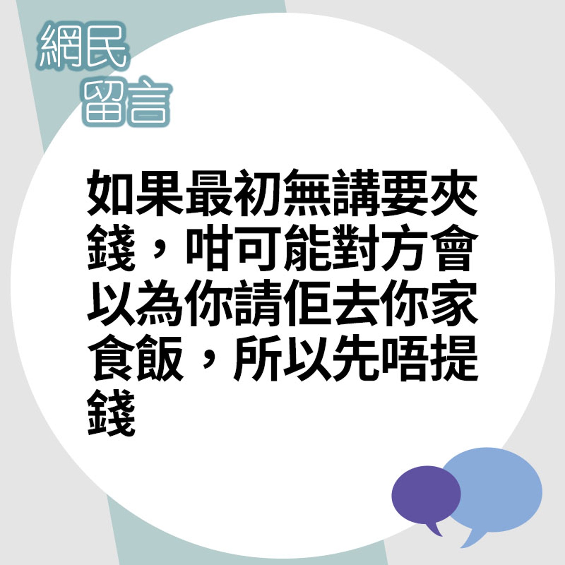 天氣寒冷,在家中打邊爐就夠晒暖笠笠,不過如果叫同親朋好友上門又應否夾錢呢?有網民在討論區上發文,指朋友上門一起打邊爐之後未有夾錢,但食的份量卻絕對不少,問大家應該如何處理。事件引來網民熱烈討論,不少人認為重點在於有沒有預先溝通,亦有人認為「叫得人上嚟食飯,一係親友,一係好友,我唔會收返人錢」。