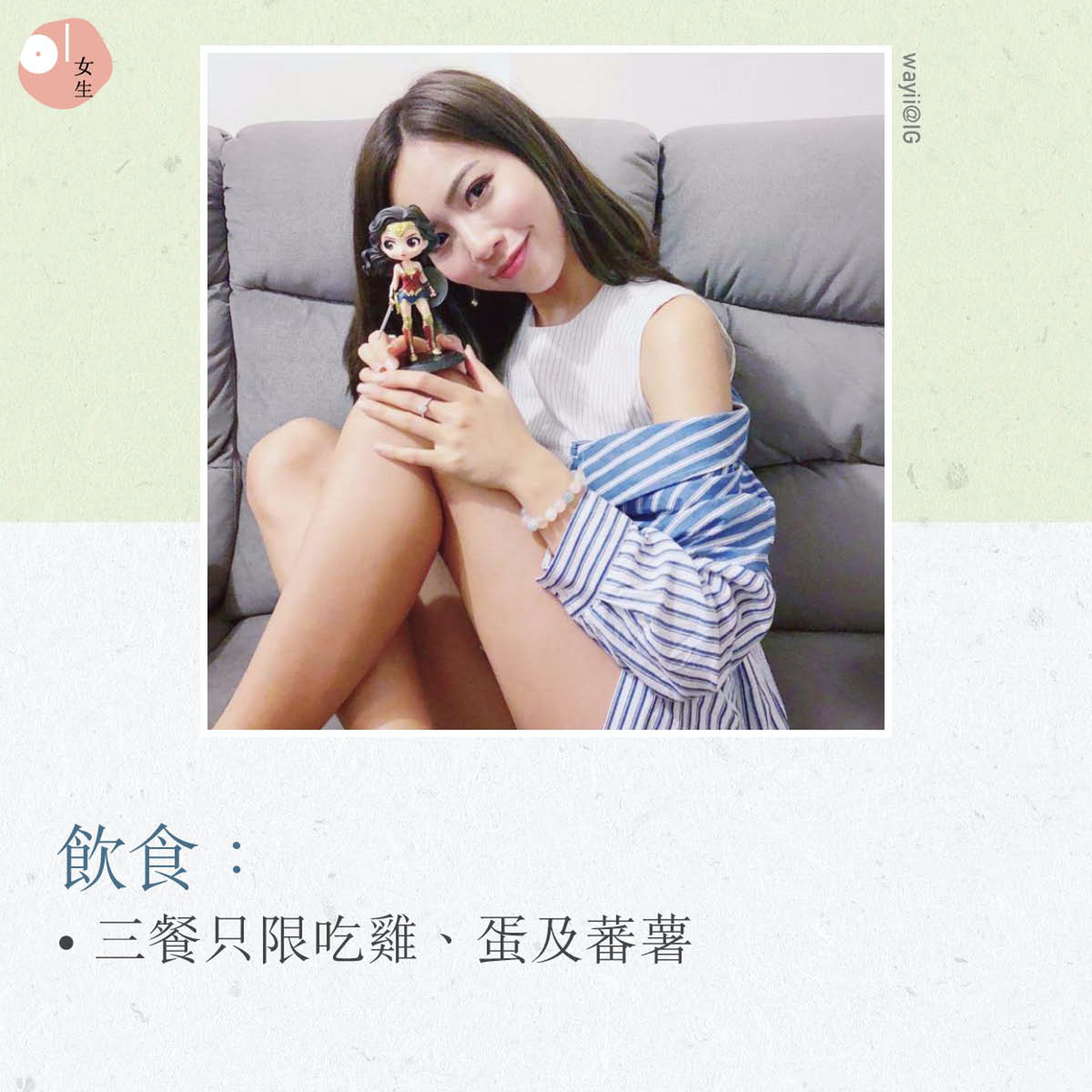 口罩小姐冠軍「浩南」鄭伊琪在社交媒體上分享,自己減肥時的飲食相當節制,即使需要工作也自備減肥餐盒,真的很想吃其他食物的話,就嗅一嗅當吃了。另外,她更會每天跑步,更曾多次邊跑邊哭,但也從不停跑,身高 172cm 的她最終由 62kg 減至 53kg。口罩小姐冠軍「浩南」鄭伊琪以自身經歷鼓勵同路人,寫道:「不是每個人都有這份毅力,每件事情願意重複做、不斷做,因為你努力可以令你走得更遠,甚至把距離拉得越遠,所以當想放棄時…你必須繼續堅持。」