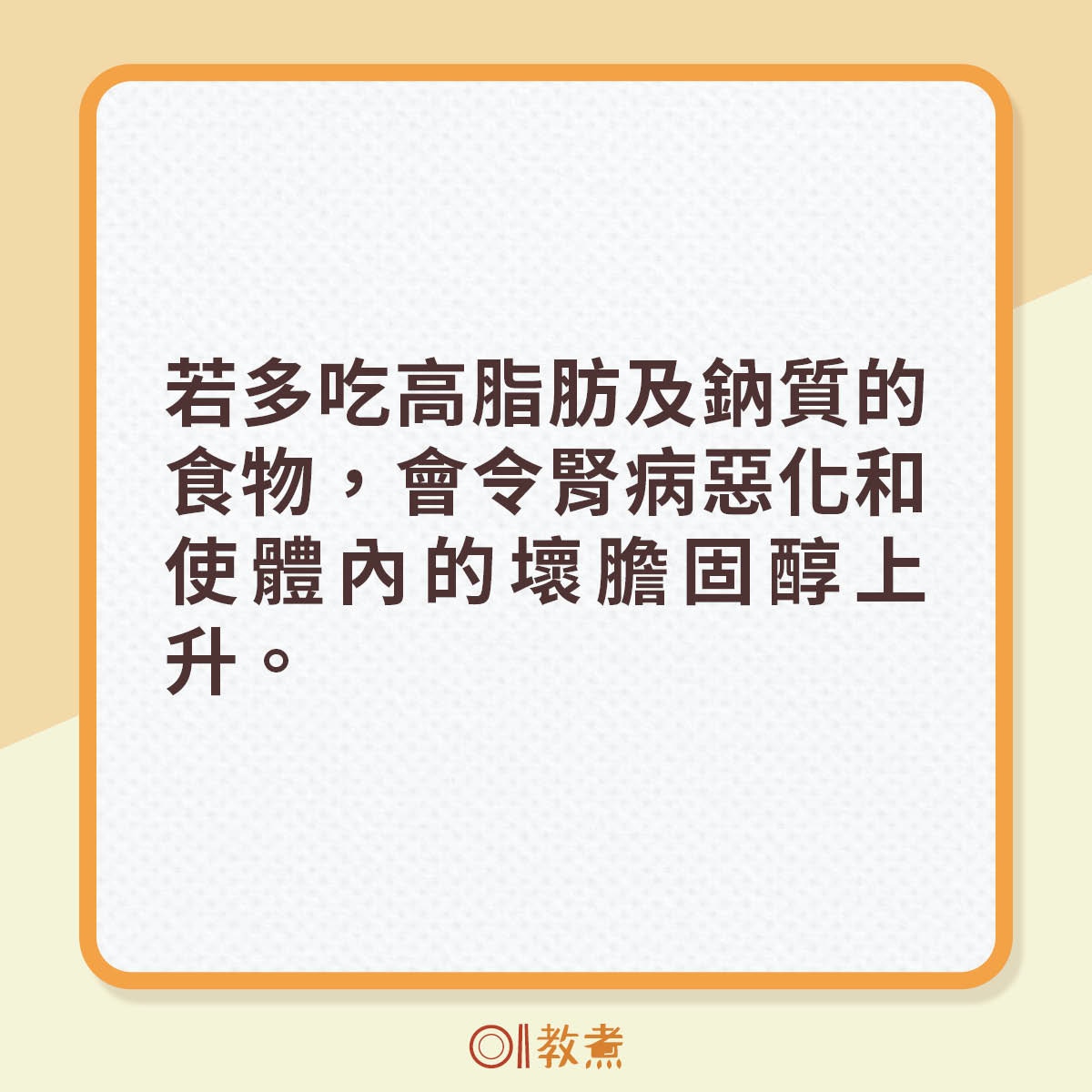 若多吃高脂肪及鈉質的食物,會令腎病惡化和使體內的壞膽固醇上升。