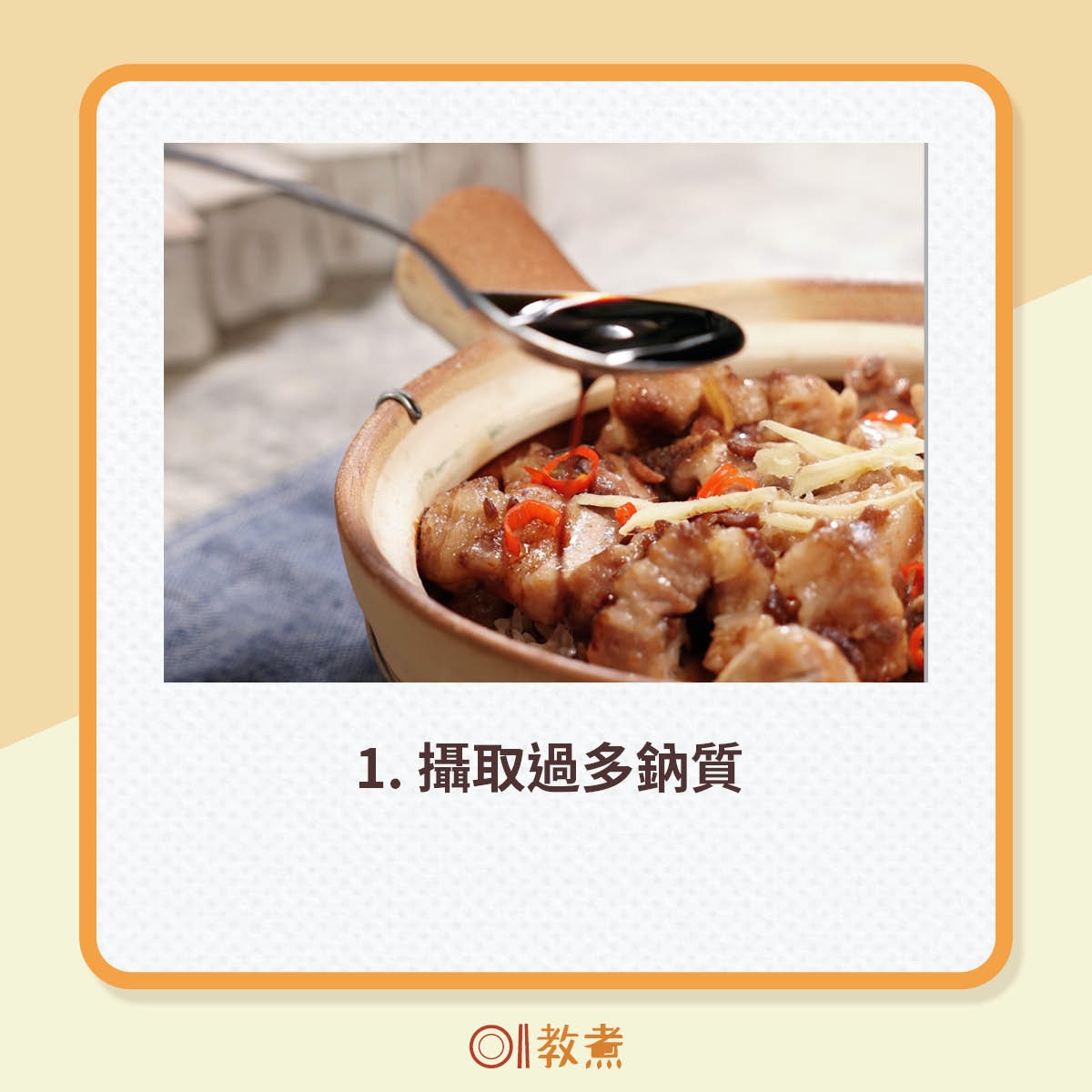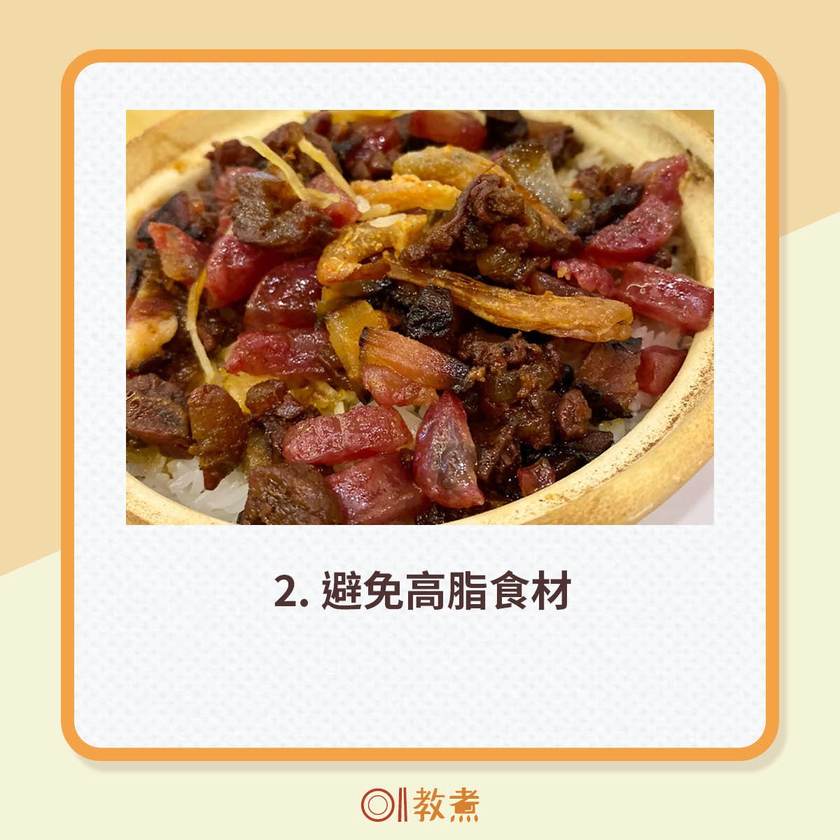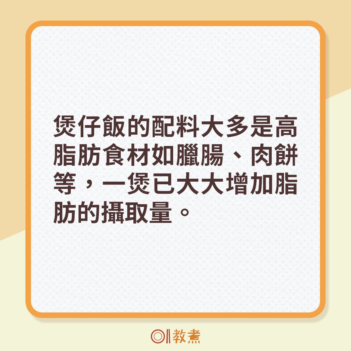 煲仔飯的配料大多是高脂肪食材,如臘、肉餅等,一煲已大大增加脂肪的攝取量。