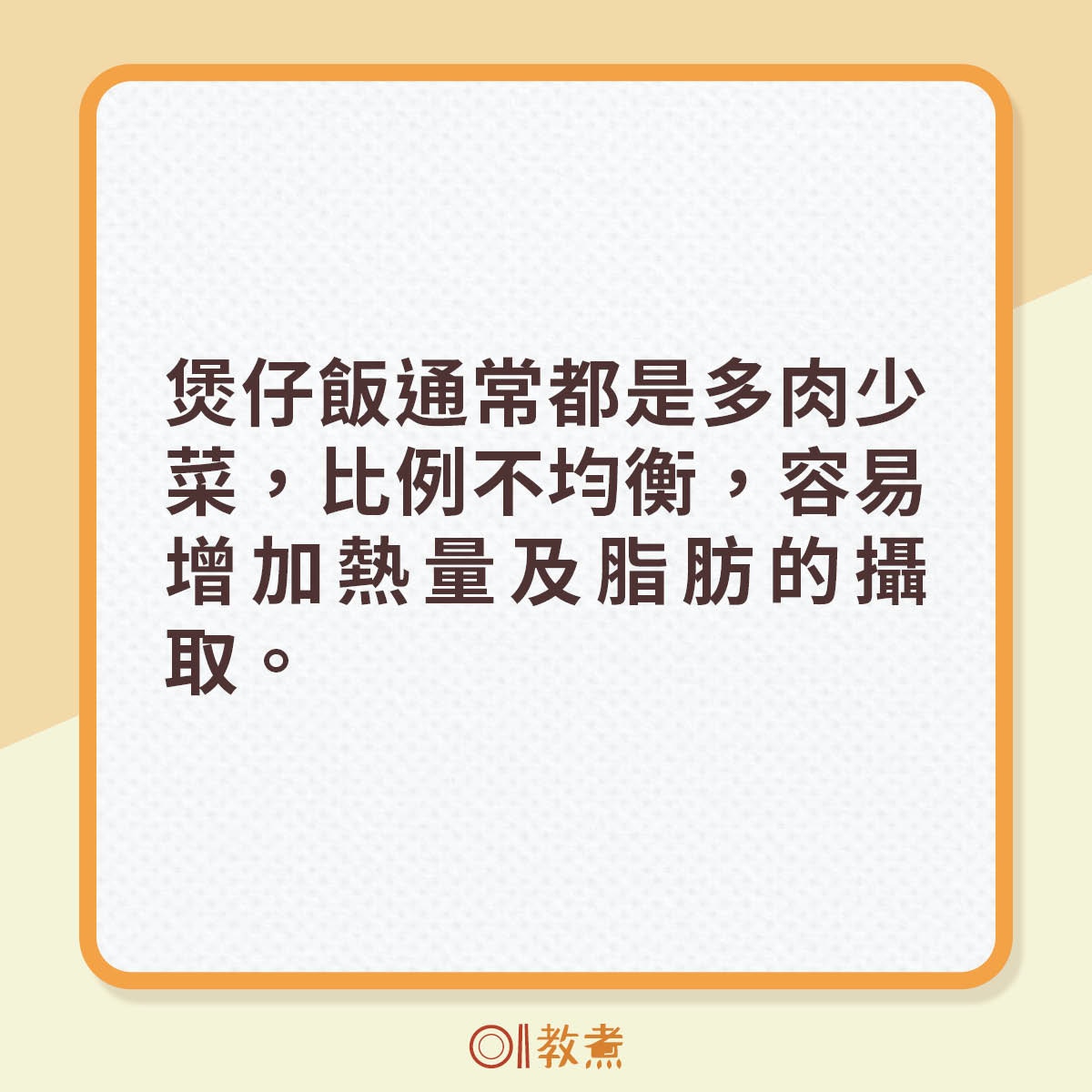煲仔飯通常都是多肉少菜,比例不均衡,容易增加熱量及脂肪的攝取。