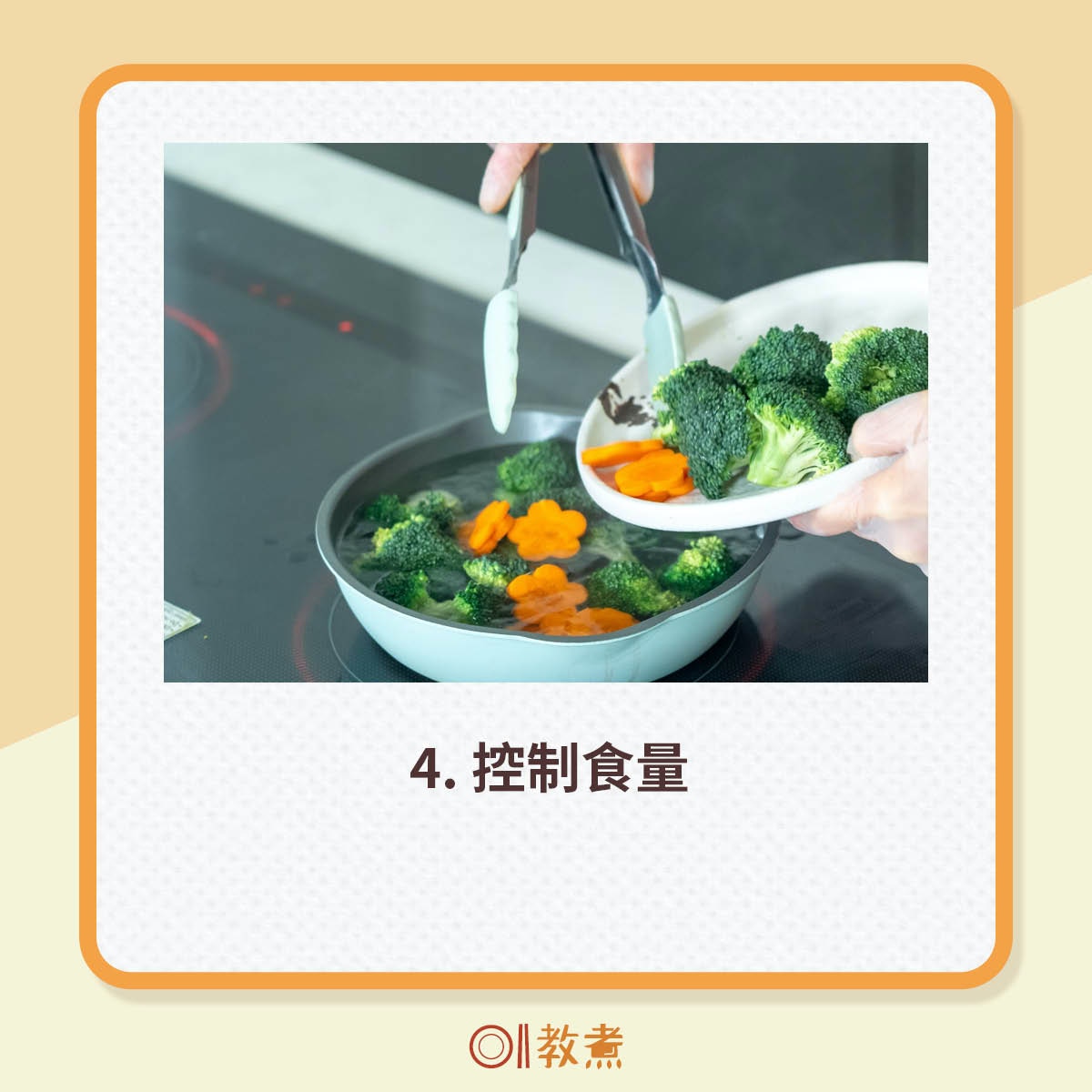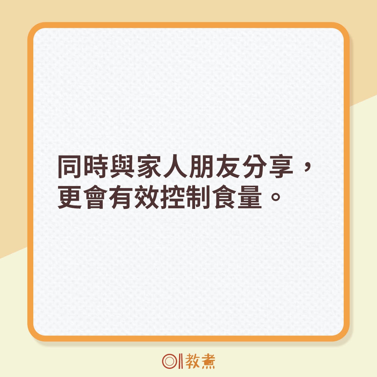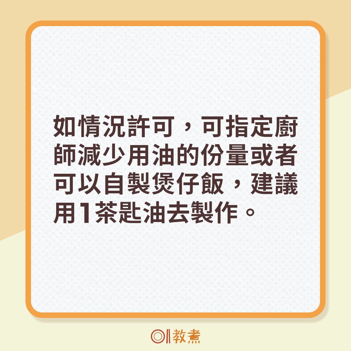 煲仔飯通常是多肉少菜,例如不均衡,建議另外加一碟「全走」的白灼蔬菜,例如菜心或生菜,增加膳食纖維及飽腹感。同時與家人朋友分享,更會有效控制食量。