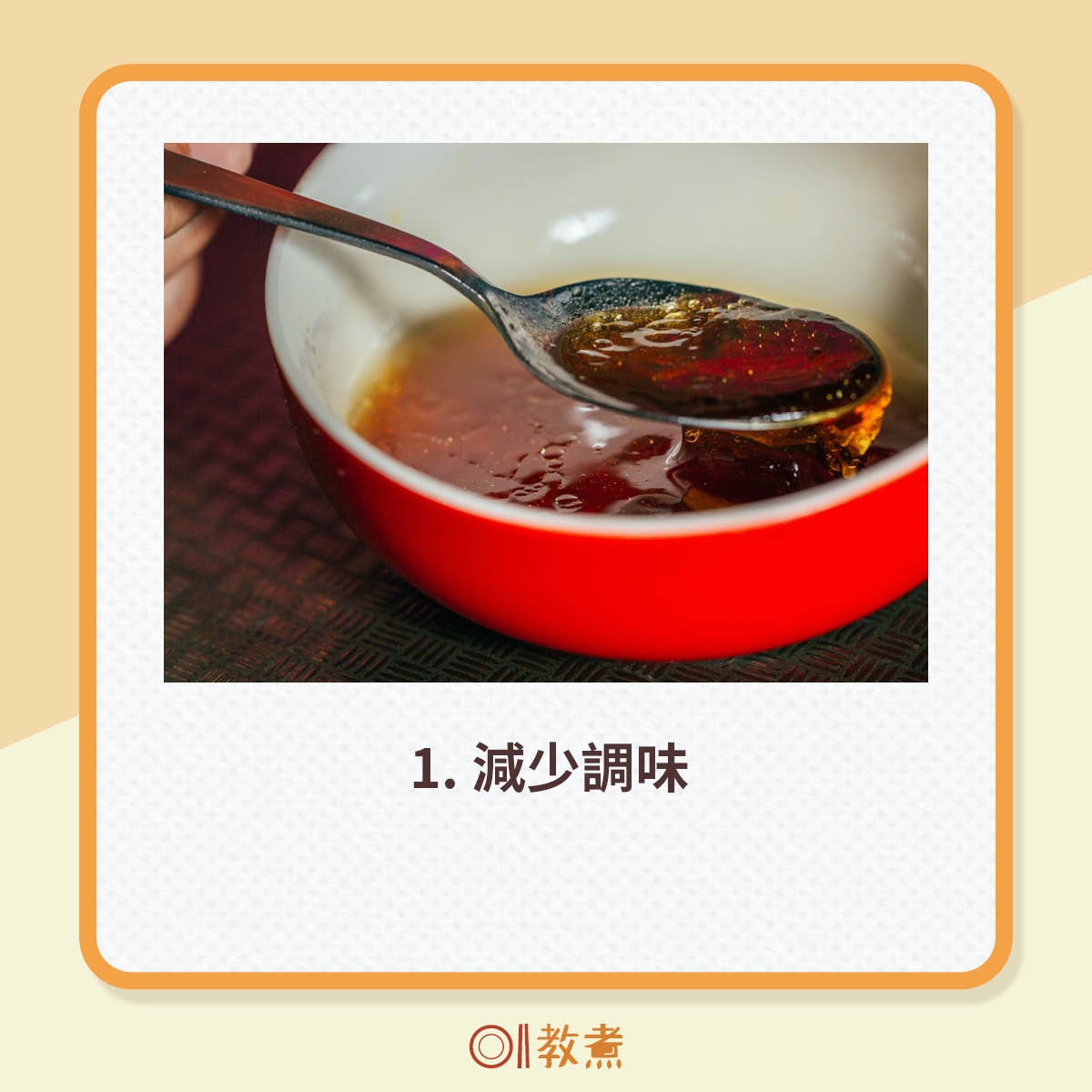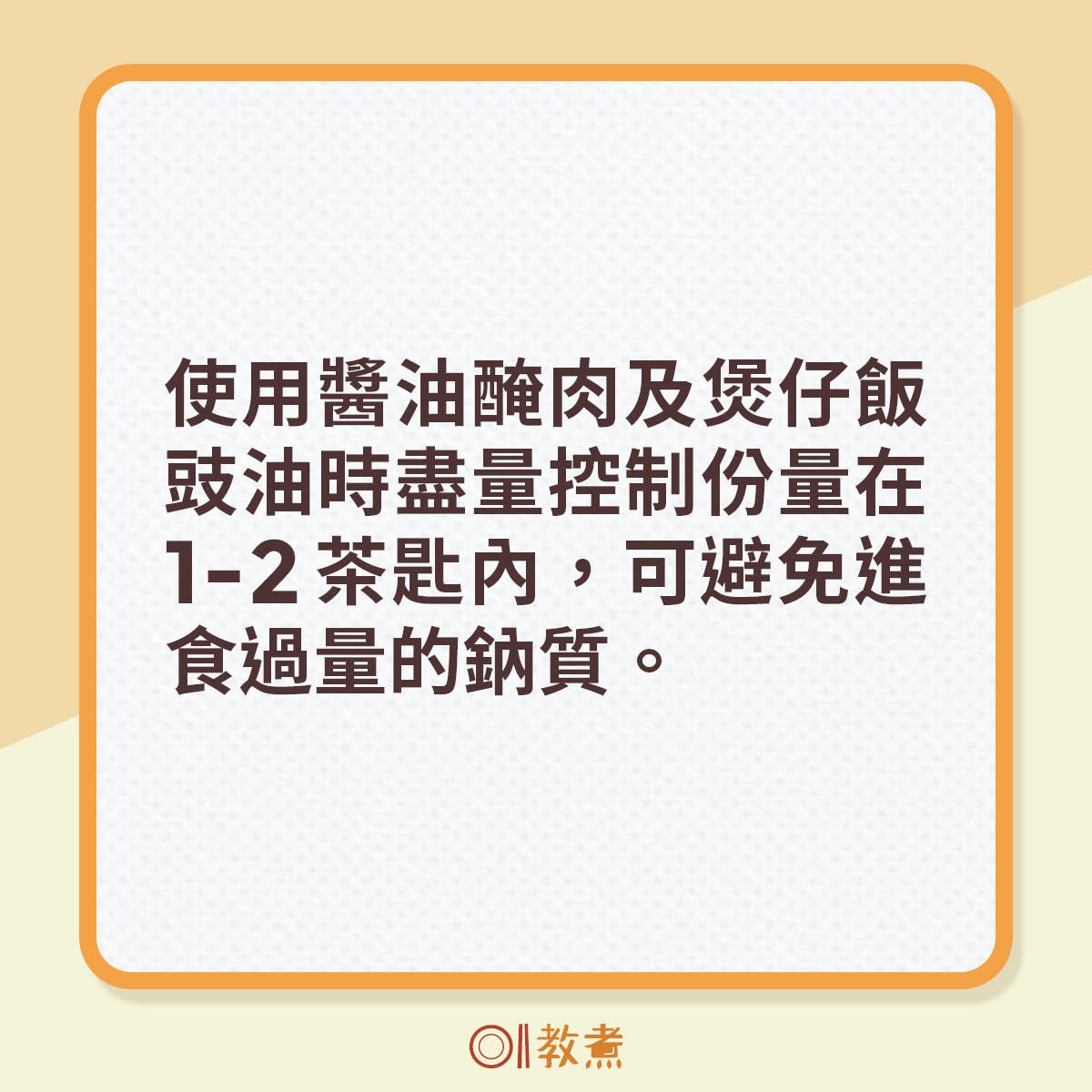使用醬油醃肉及煲仔飯豉油時,量控制分量在 1 – 2 茶匙內,可避免進食過量的鍋質。