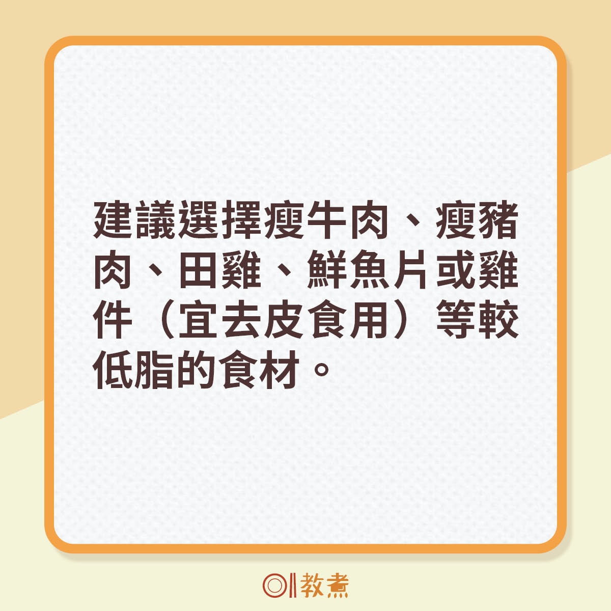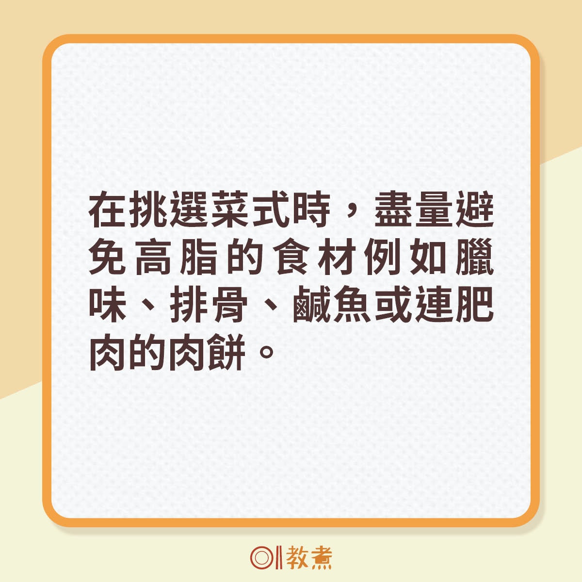 在挑選菜式時,盡量避免高脂的食材,如臘味、排骨、鹹魚或連肥肉的肉餅。建議選擇瘦牛肉、瘦豬肉、田雞、鮮魚片或雞件(宜去皮食用)等較低脂的食材。