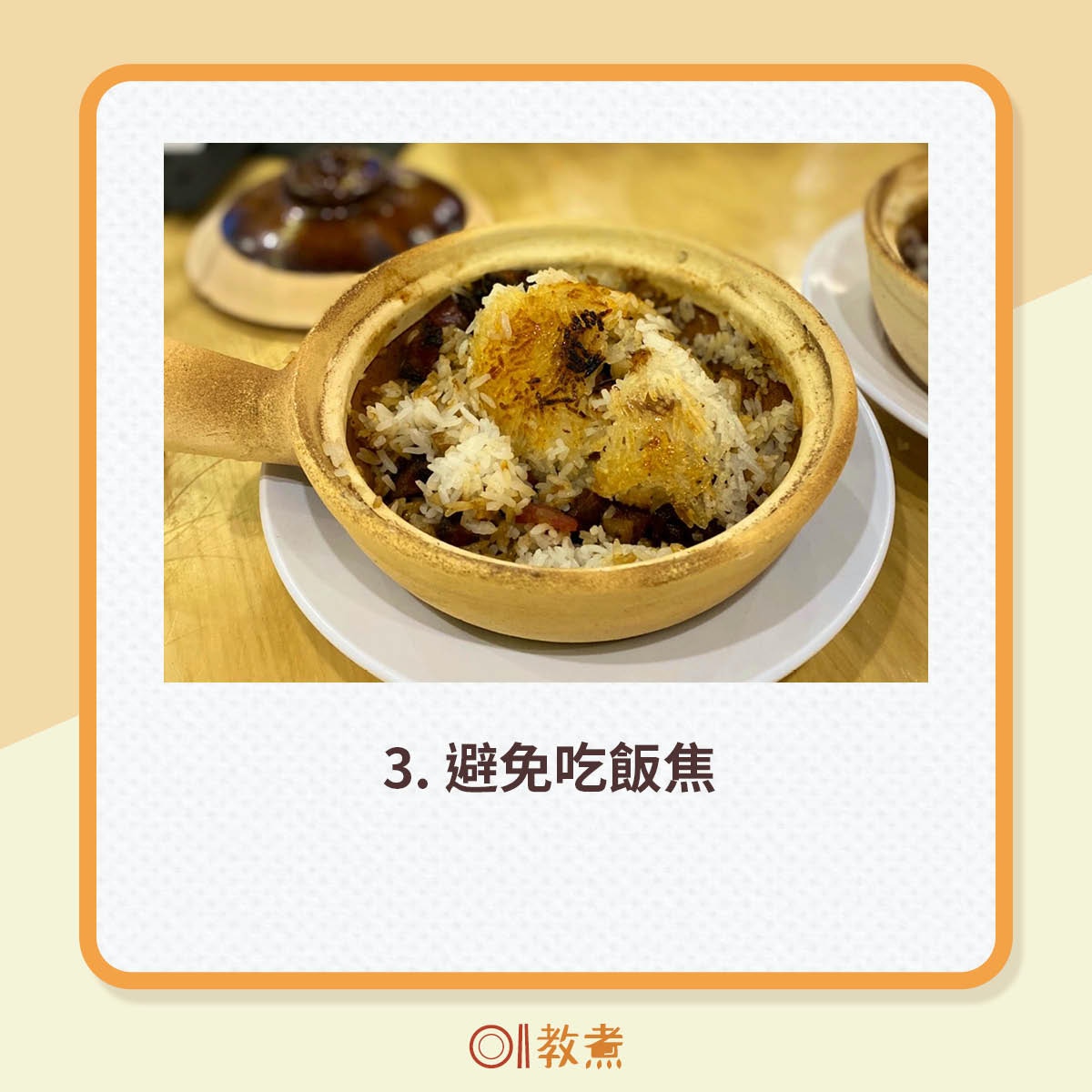 飯焦吸了不少煲底的油分,令我們不經意地攝取過多油脂,所以少吃飯焦會較為健康。如情況許可,可指定廚師減少用油的分量或者可以自製煲仔飯,建議用 1 茶匙油去製作。