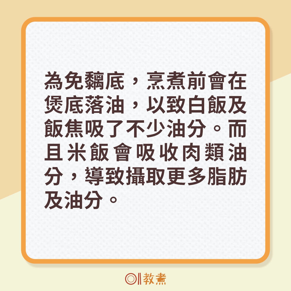 為免黐底,烹煮前會在煲底落油,以致白飯及飯焦吸了不少油分。而且米飯會吸收肉類油分,導致攝取更多脂肪及油分。