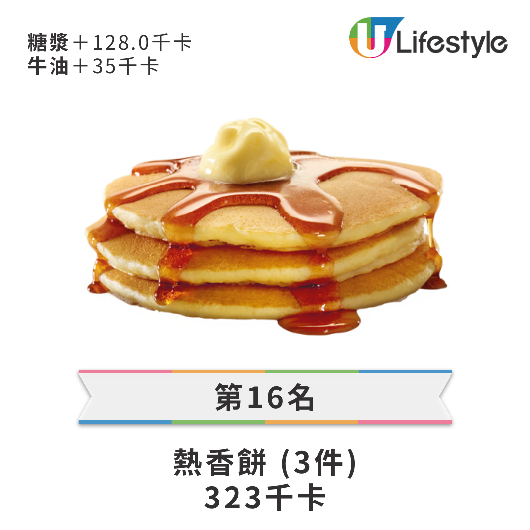 • 第 16 名: 熱香餅 (3件) — 323 kcal (糖漿+128, 牛油+35)