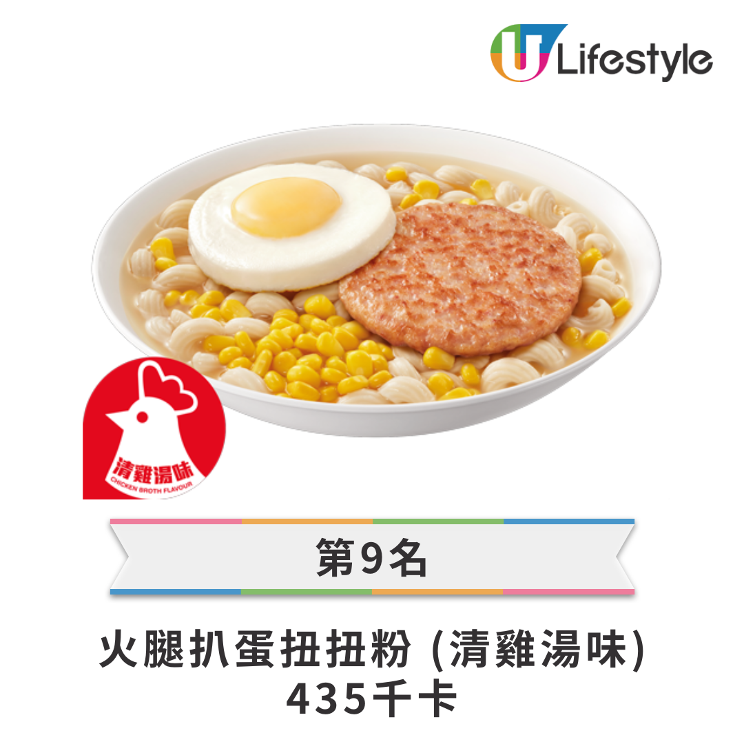 • 第 9 名: 火腿扒蛋扭扭粉 (清雞湯味) — 435 kcal
