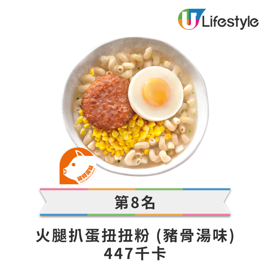 • 第 8 名: 火腿扒蛋扭扭粉 (豬骨湯味) — 447 kcal