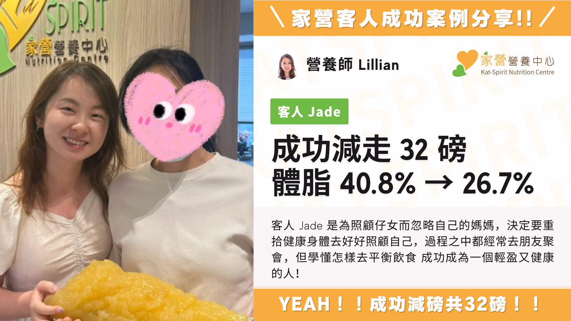 客人 Jade 是為照顧仔女而忽略自己的媽媽,決定要重拾健康身體去好好照顧自己,過程之中都經常去朋友聚會,但學懂怎樣去平衡飲食 成功成為一個輕盈又健康的人!