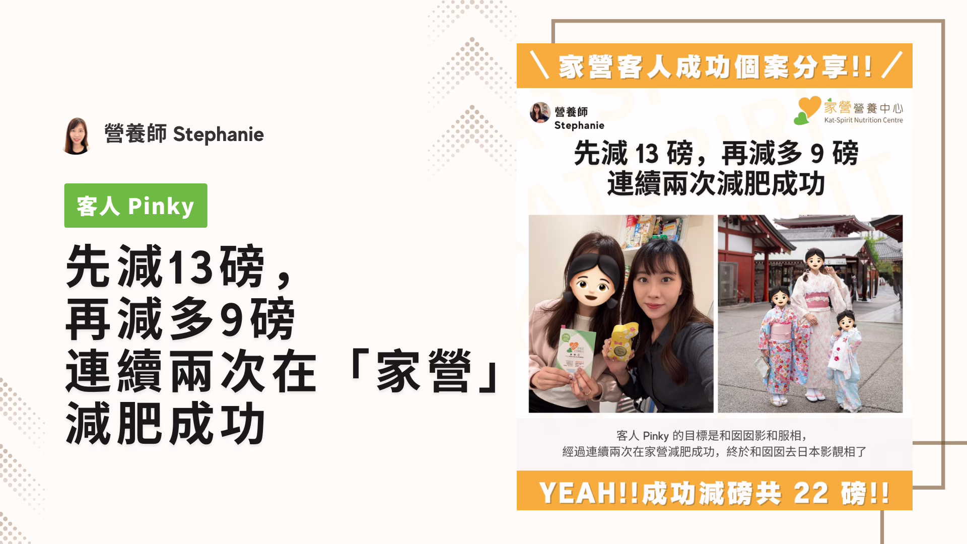 客人 Pinky 的目標是和囡囡影和服相,經過連續兩次減肥成功,終於和囡囡去日本影靚相了…