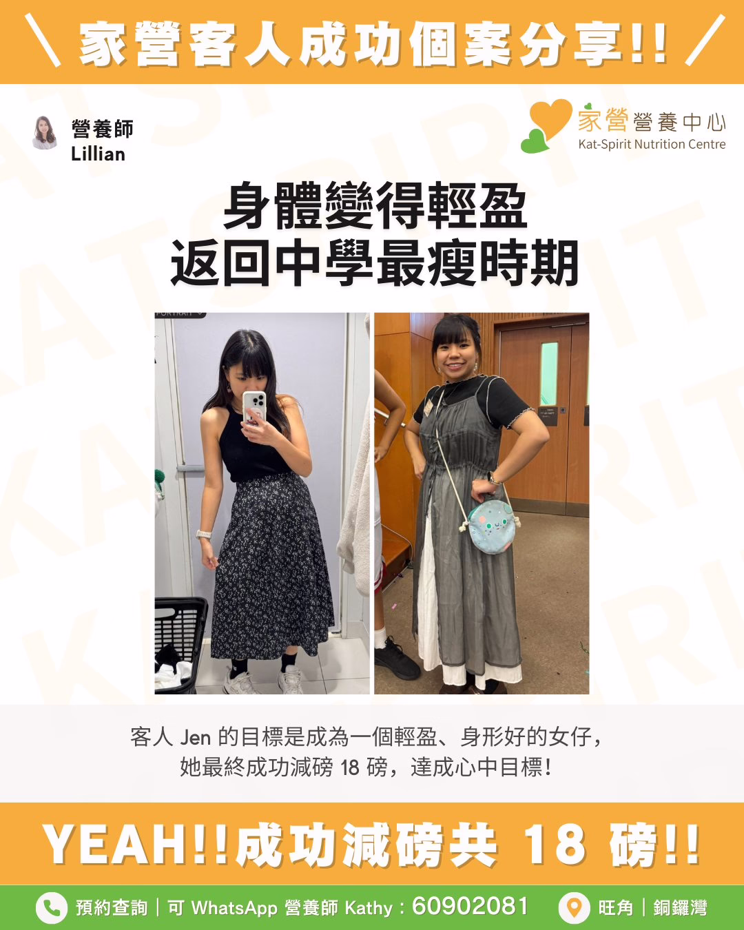 客人 Jen 的目標是成為一個輕盈、身形好的女仔,她最終成功減磅 18 磅,達成心中目標!![]()