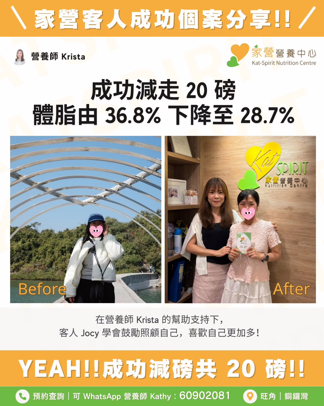 但 Krista 常常幫助我面對內在自己感受,了解返阻礙到自己減磅的原因,在不同地方去幫我搵到可進步的地方,鼓勵我照顧自己。我發現自己喜歡自己多咗,亦會照顧自己,學習準備和煮簡單美味的食物給自己。