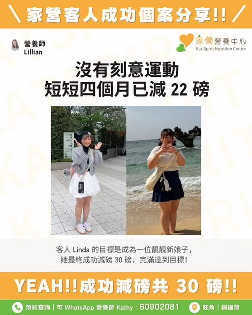 「係朋友介紹下去試下,Lillian 好溫柔咁比好多建議我,因為午餐係公司安排,Lillian 都比左好多替代嘅建議我,四個月差唔多減咗 10 kg,仲要係唔洗做運動嘅情況下都可以減到肥真係好開心。」Linda 朋友 Jen 也參加了「家營」的營養輔導課程,Jen 亦成功減了 18 磅呢!下次再和大家分享 Jen 的目標和感言